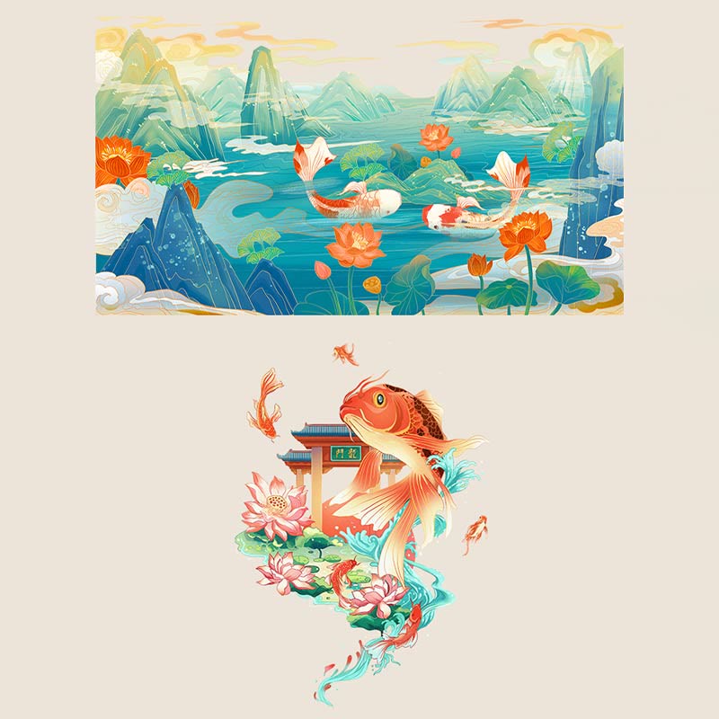 El pez siempre ha sido uno de los símbolos de buena suerte más utilizados y que se correlaciona con la atracción de riqueza y abundancia en el mundo del feng shui, porque la palabra pez en chino (yu) suena como "excedente", lo que representa un desbordamiento de buena fortuna. Además, los peces pertenecen al elemento agua y, en la creencia china, el agua también simboliza riqueza y prosperidad. Además de estos, el pez koi también es un símbolo de éxito y determinación. Además, el koi está ligado al símbolo yin yang. de hecho, se dice que las lágrimas blancas y negras del símbolo yin yang son representaciones de dos koi, uno masculino y otro femenino. por lo tanto, un par de koi se utiliza a menudo como símbolo de buena suerte para un matrimonio feliz.