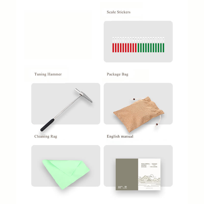 - El paquete incluye: kalimba*1, bolsa de paquete*1, cancionero de kalimba*1, martillo de afinación*1, pegatina de notas*1, paño de limpieza*1
