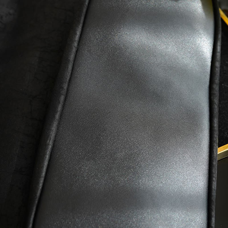 - Material: seda morera, seda Xiangyunsha, piel de vacuno, poliéster, metal.