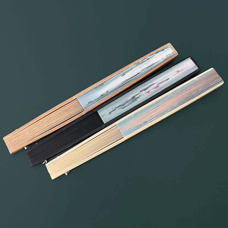 Abanico plegable de mano con marcos de bambú, hoja de flor de loto Retro con Buddha Stones , lago de montaña