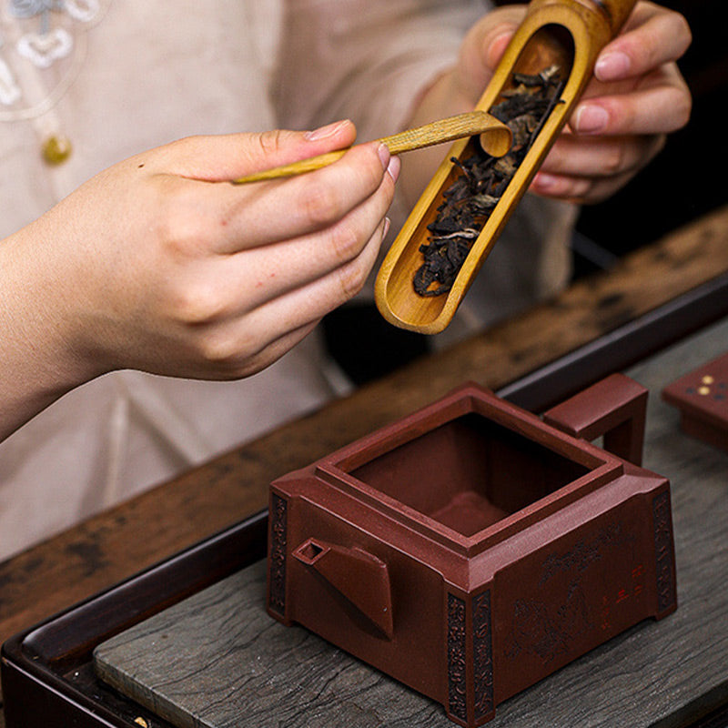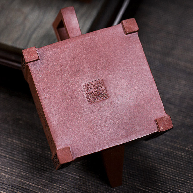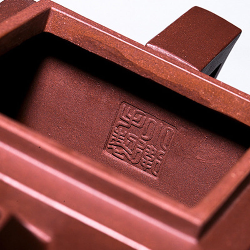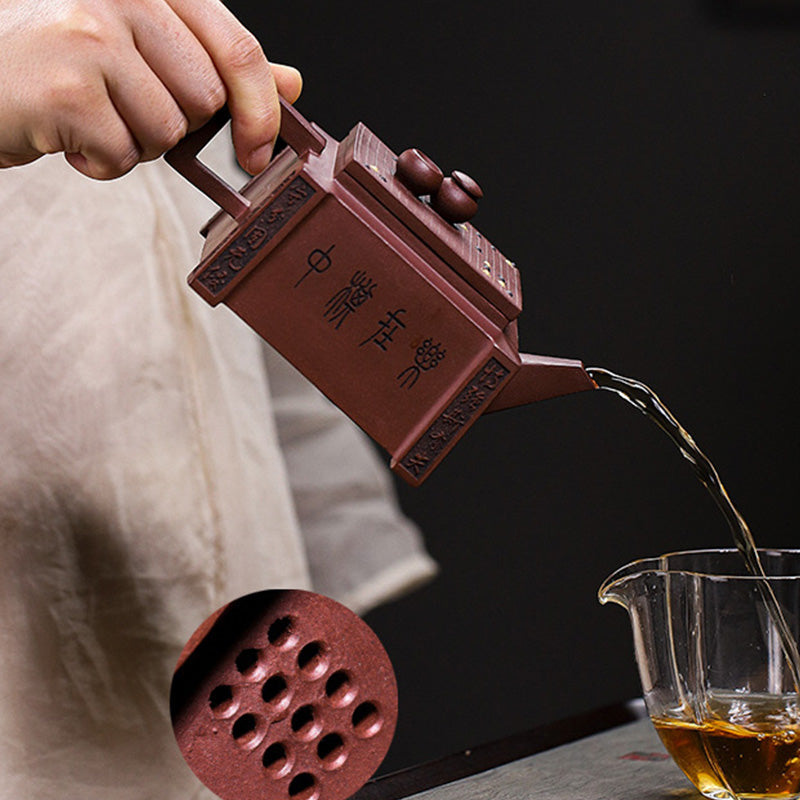 La tetera artesanal está hecha de arcilla morada. Sigue un proceso de creación totalmente artesanal. Está hecho a mano por el maestro wu xiao wei. Esta tetera tiene una forma cuadrada clásica con decoración gomoku, dejando que la belleza de la arcilla púrpura y la mano de obra hablen por sí solas. en el lado izquierdo de la tetera hay una imagen de dos personas jugando al ajedrez, y en el lado derecho están las palabras "disfruta jugando al ajedrez" (chino:乐在棋中).