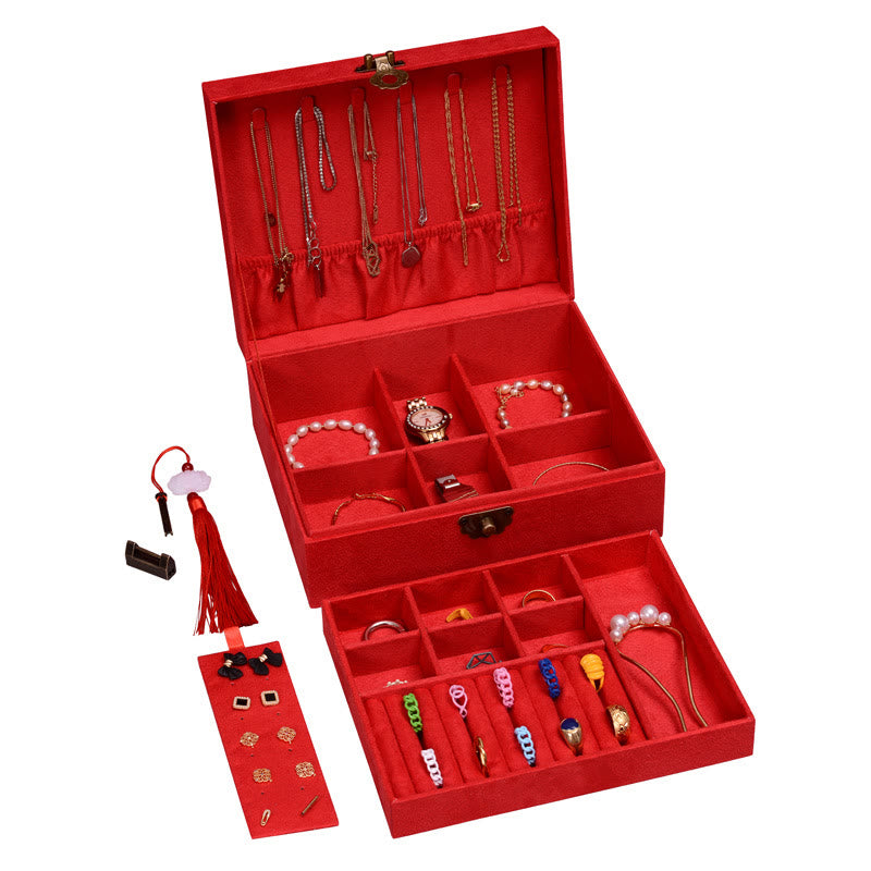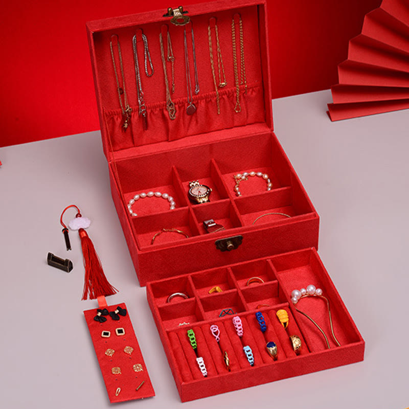 Caja organizadora de joyas de diseño Simple con Buddha Stones, caja de almacenamiento de joyas de dos capas, caja de franela con cerradura - Rojo 23 x 19 x 6,5 cm - image 19