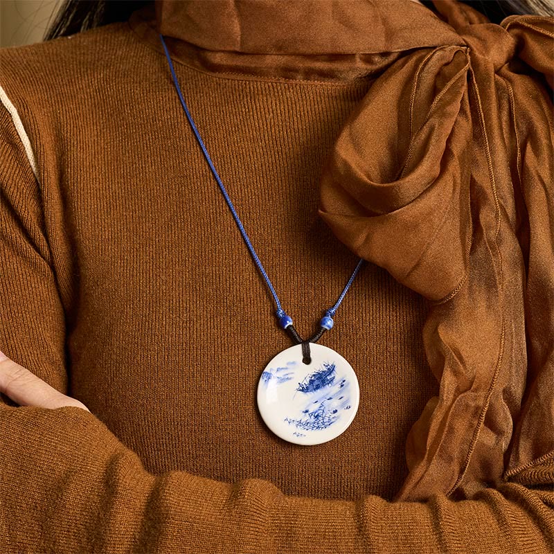 Collar de cerámica con símbolo de loto, peonía étnica, flores de melocotón y piedras de Buddha Stones, colgante de iluminación. - Paisaje de barco en el río brumoso - image 18