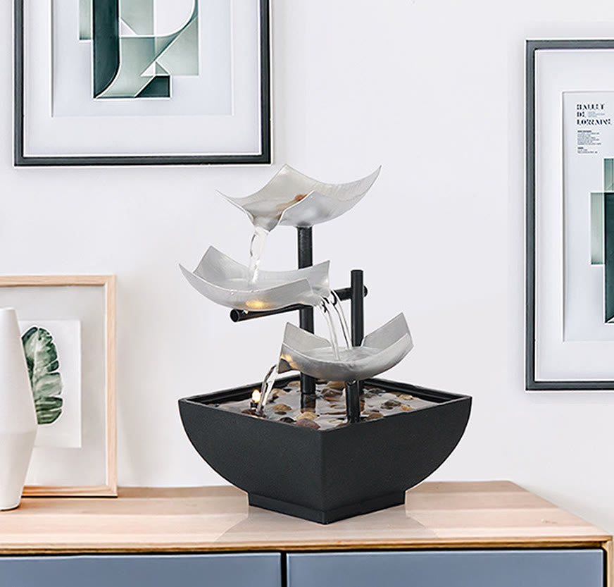 - fuente de mesa decorativa de feng shui : aporta una sensación relajante, zen y decorativa a cualquier habitación; 3 niveles crean un suave y relajante flujo de agua que reproduce las vistas y los sonidos de un manantial tranquilo.