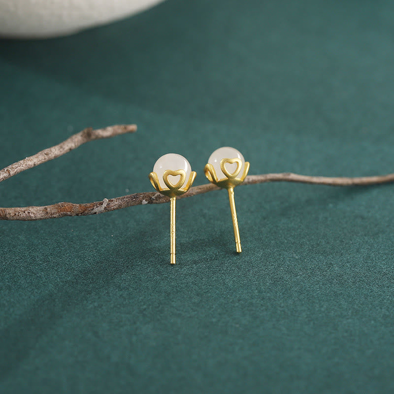 Buddha Stones Pendientes de encaje en forma de corazón de plata de ley 925 con jade Hetian y diseño de armonía. - Jade Hetian (Postes de plata de ley 925 chapados en oro) - image 0