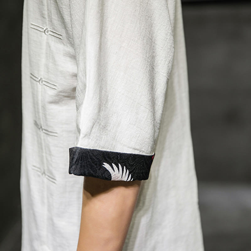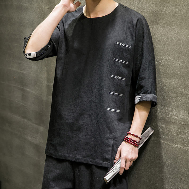 Camiseta de lino y algodón con diseño de patchwork de color sólido retro de verano con Buddha Stones para hombre, de manga tres cuartos - image 33