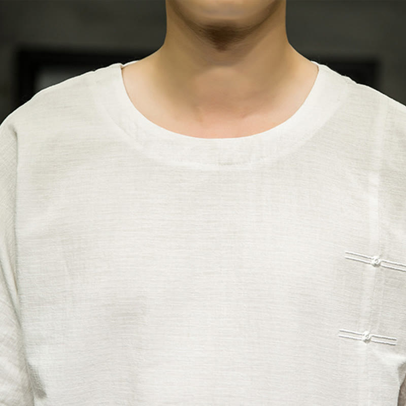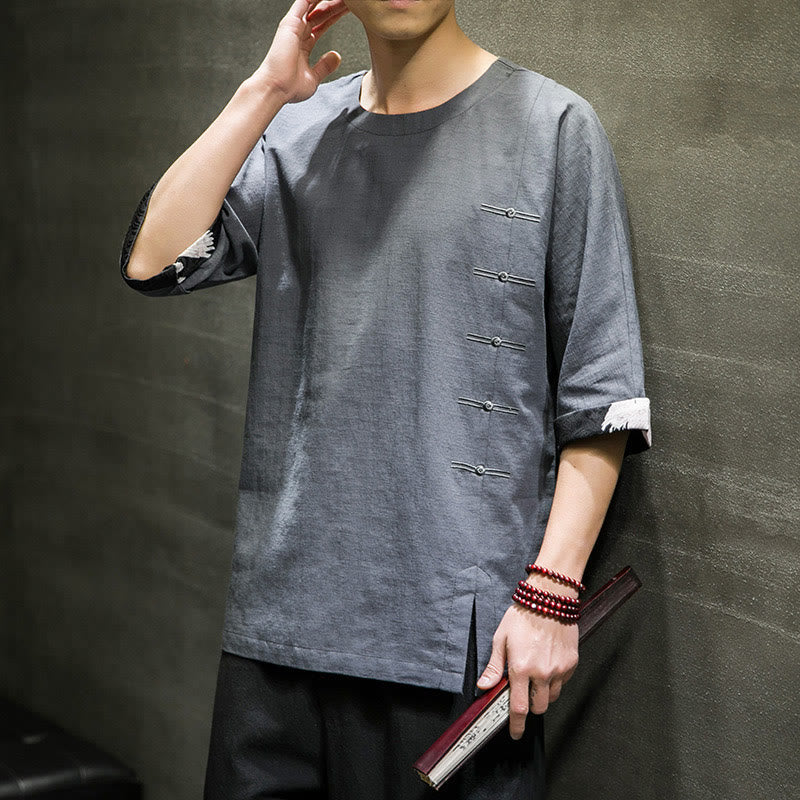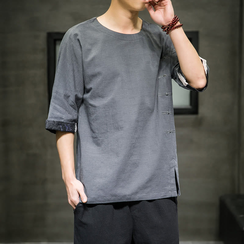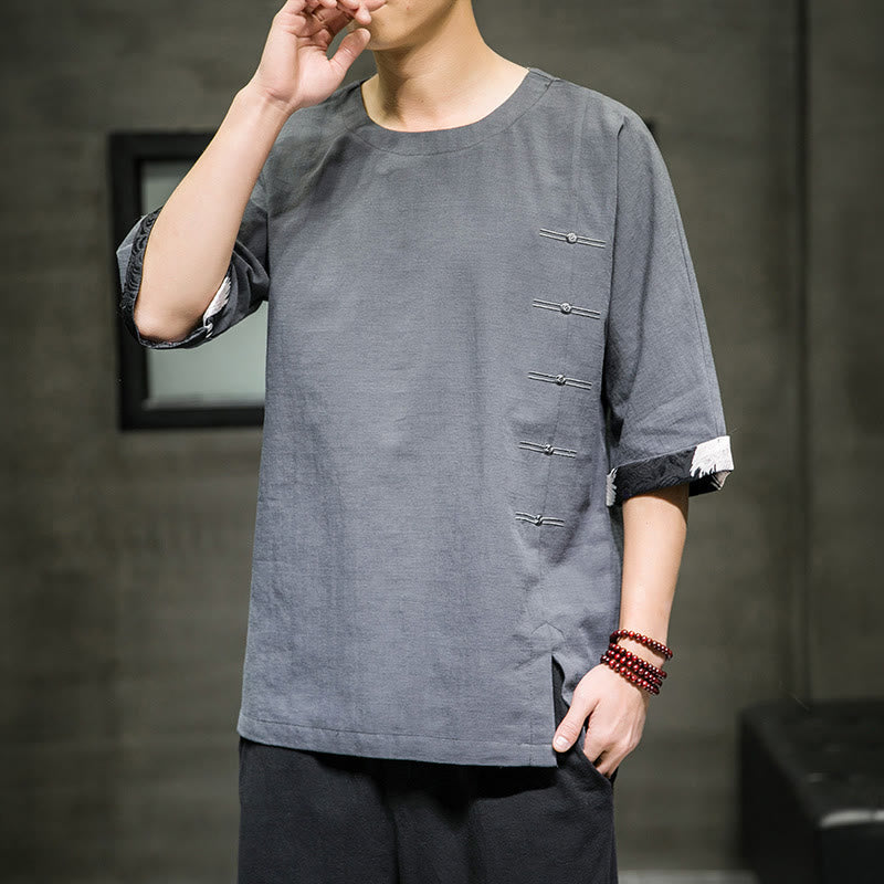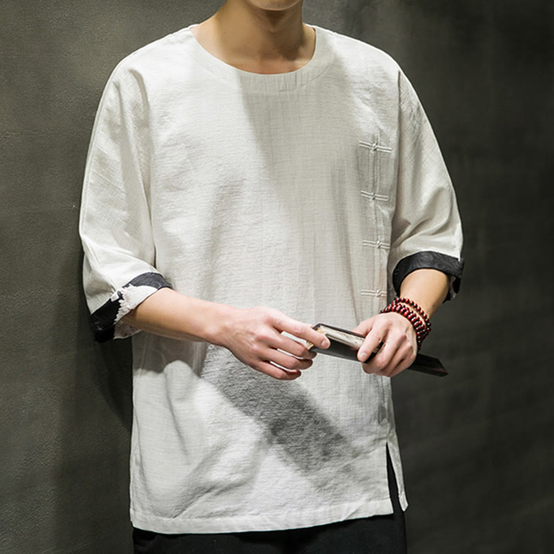 Camiseta de lino y algodón con diseño de patchwork de color sólido retro de verano con Buddha Stones para hombre, de manga tres cuartos