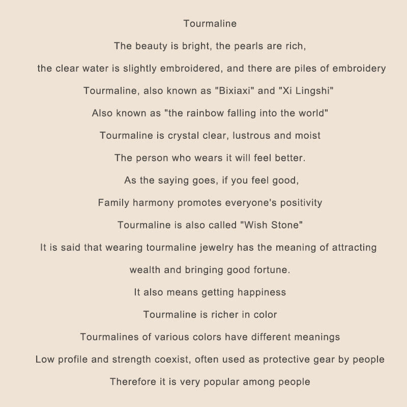 La turmalina es una gema llena de energía. El efecto de la turmalina varía de un cuerpo a otro. Según el tipo de color, las más comunes son la turmalina negra, la turmalina rosa, la rubelita, la turmalina verde, la turmalina amarilla, la indicolita y la dravita, etc.