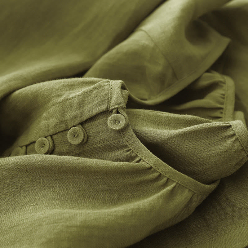 Vestido midi de lino y algodón con cuello redondo, mangas cortas y cordones, de Buddha Stones Spring - Verde oliva - US14,UK/AU18,EU46 (2XL) - image 0