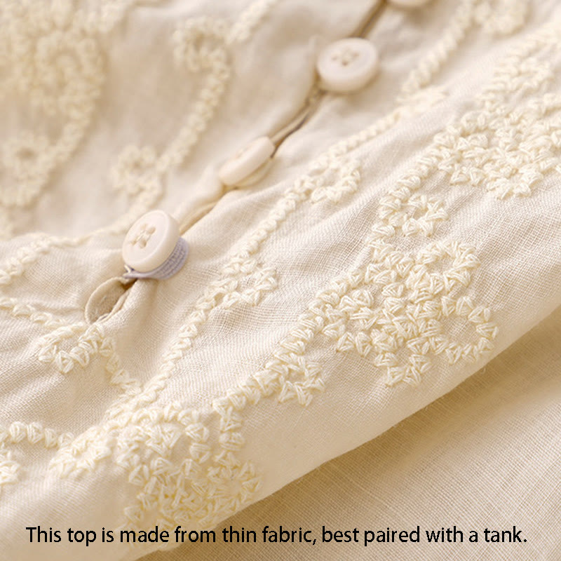 Camisa de algodón para mujer con cuello redondo, manga corta y botones bordados con líneas de Buddha Stones - image 10