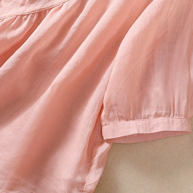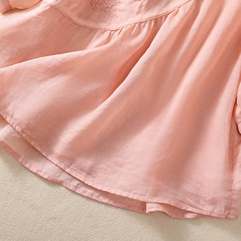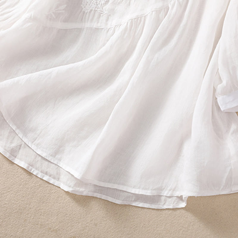 Camisa de algodón y lino de media manga para mujer con diseño floral bordado con Buddha Stones y cuello redondo