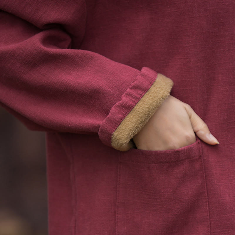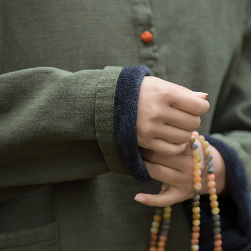 Camisa de lino y ramio de manga larga térmica de color sólido retro con Buddha Stones para mujer