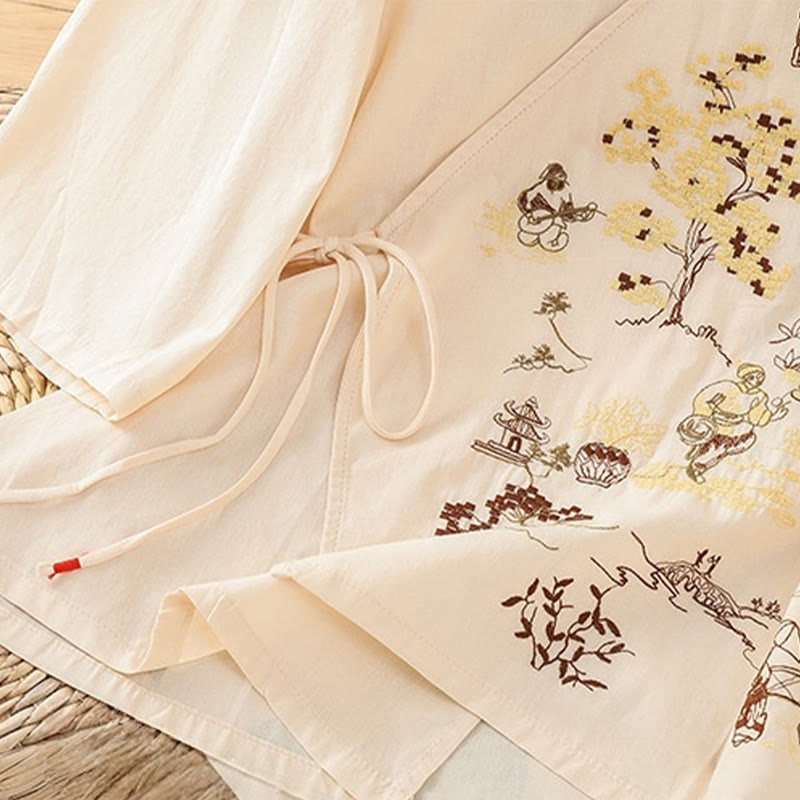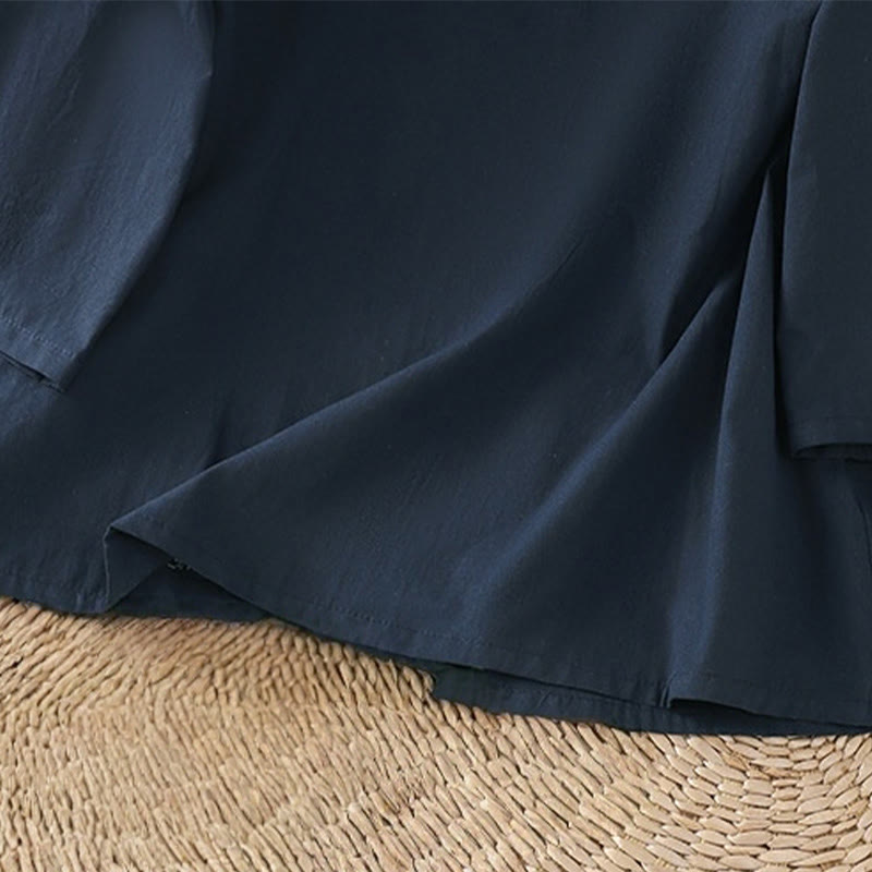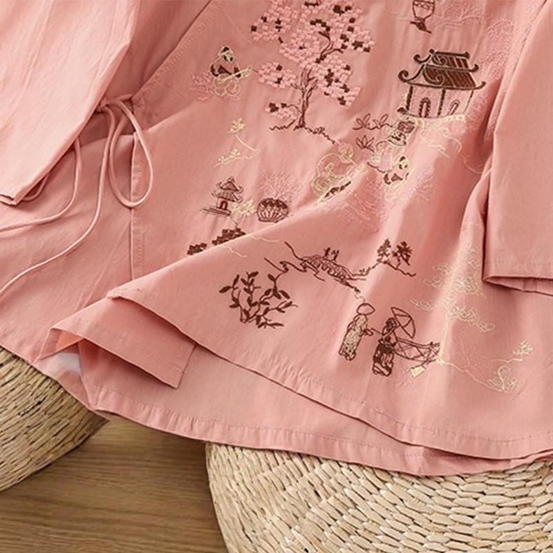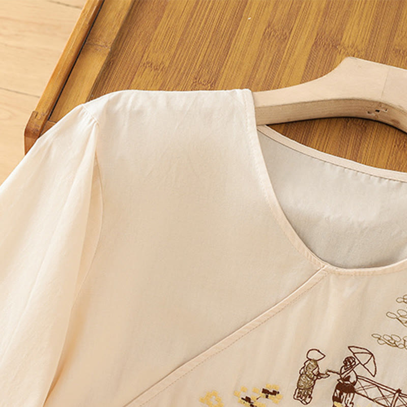 Camiseta de lino y algodón con bordado retro de Buddha Stones , con cordones, manga tres cuartos para mujer - image 16