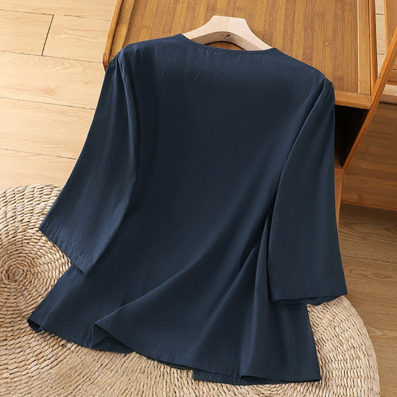 Camiseta de lino y algodón con bordado retro de Buddha Stones , con cordones, manga tres cuartos para mujer - image 1