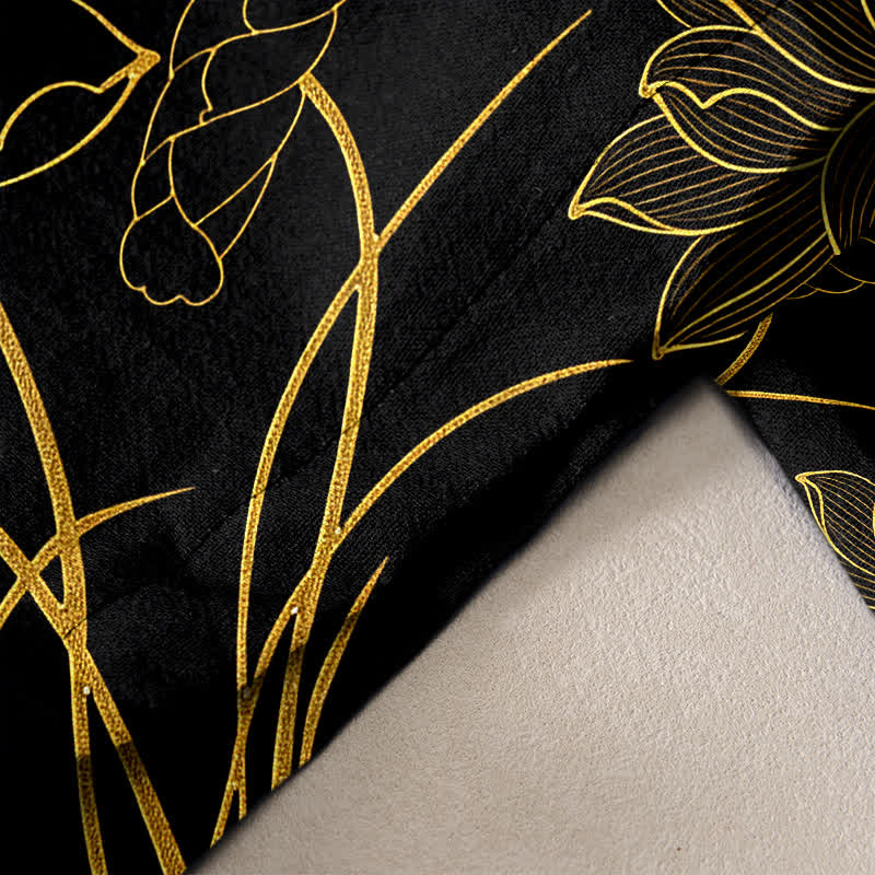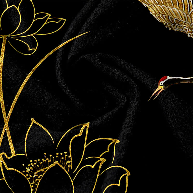 - Diseño : El motivo de la grulla evoca el simbolismo oriental de longevidad, gracia y buena fortuna. La imagen del loto transmite pureza, renovación espiritual y elegancia refinada. Juntos, el estampado dorado metalizado crea un punto focal ornamentado y auspicioso que complementa la silueta relajada del harén.