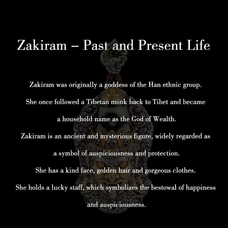 Zakiram es una deidad guardiana cuya imagen simboliza el poder de la tutela y protección de la fe y puede proteger a los practicantes del mal y la desgracia.