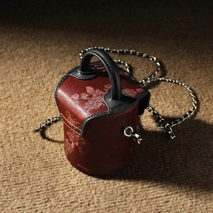 - Material: seda morera, seda Xiangyunsha, piel de vacuno, metal, cadena de metal