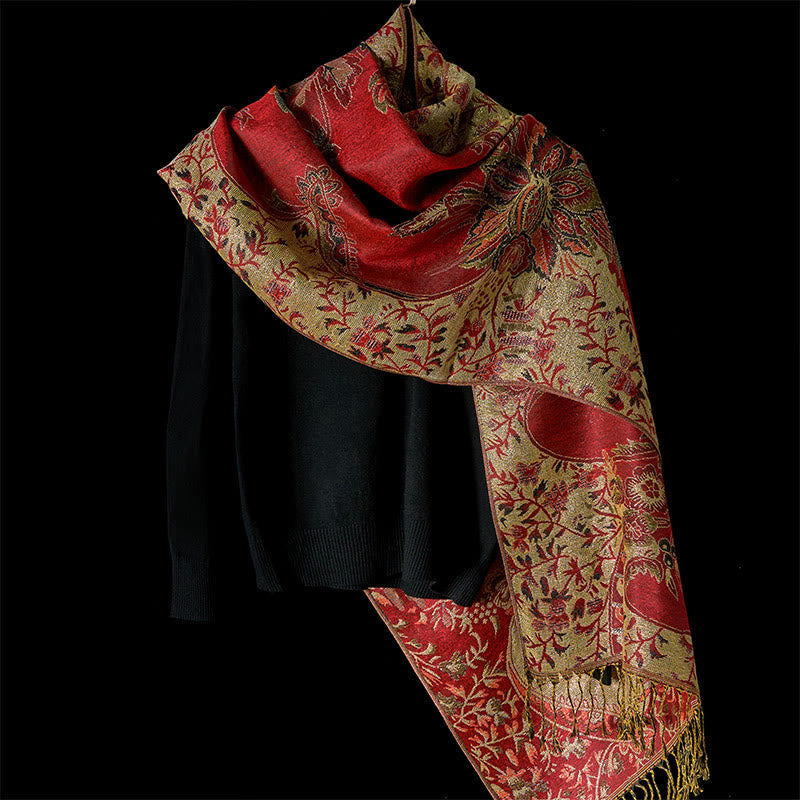 Bufanda chal suave con borlas y diseño de flores rojas de primavera y vides con piedras de Buddha Stones