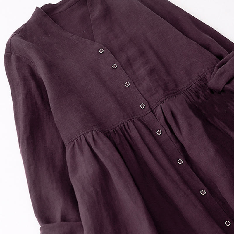 Vestido midi de algodón con mangas largas y cuello en V y botones en color magenta oscuro con estampado de Buddha Stones Fall