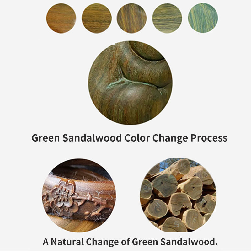 El color del sándalo verde es un proceso de cambio, no un color fijo. Al principio, el sándalo verde recién cortado suele ser amarillento, y luego se oxida lentamente, tornándose verde y más oscuro con el tiempo. Hay amarillo, marrón, verde, etc., en diferentes etapas, y el sándalo verde tiene textura; ¡no todos son iguales!