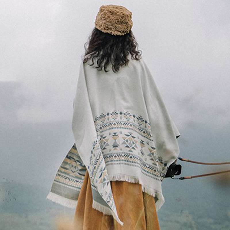 Chal cálido con borlas y diseño geométrico tibetano en color beige con Buddha Stones para otoño e invierno