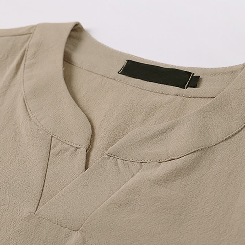 Buddha Stones Camiseta de manga corta con cuello de muesca y bordados para hombre, de algodón y lino, ideal para el verano.