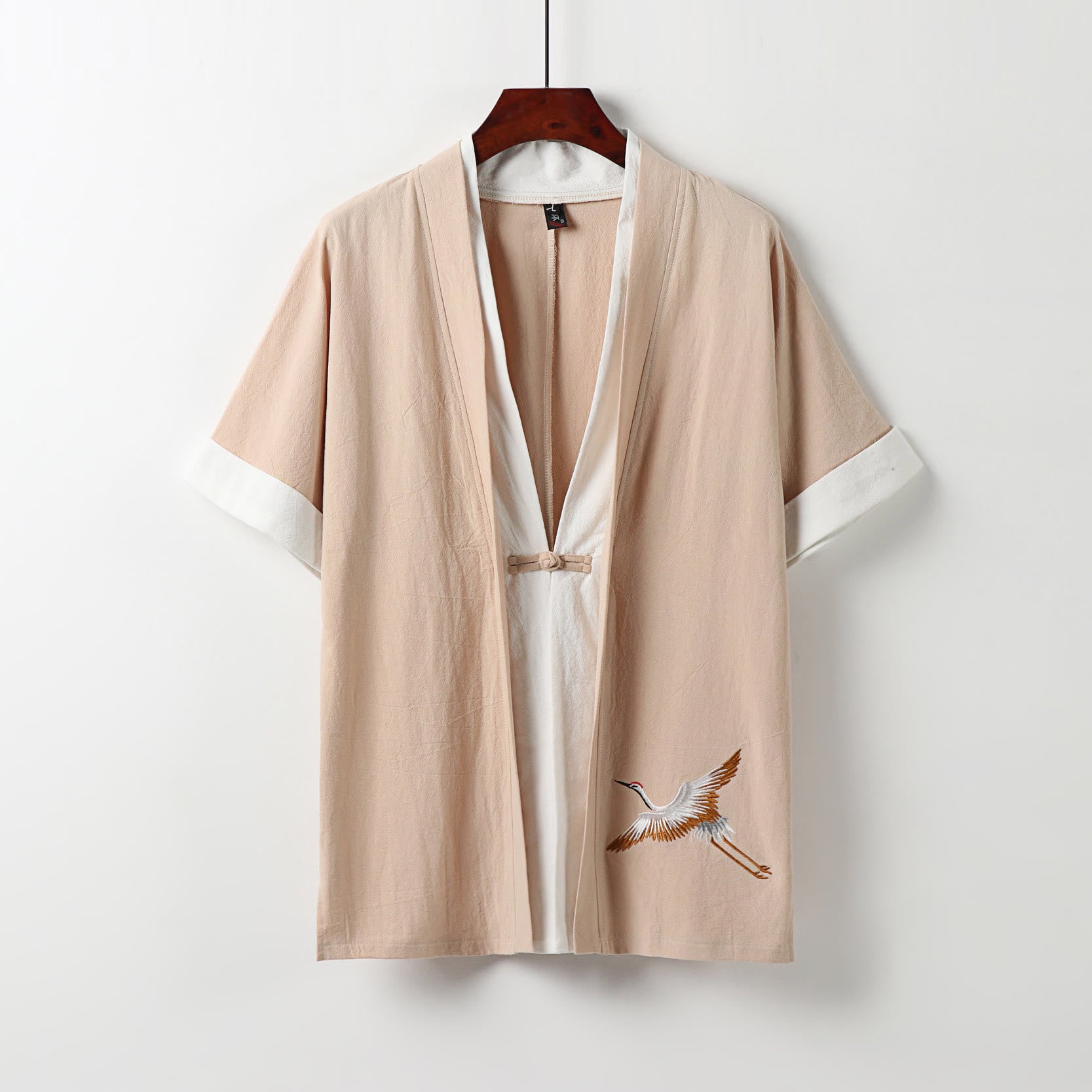 Camisa cómoda de algodón Hanfu con bordado de Buddha Stones de dos piezas para hombre, de media manga y falso cárdigan - image 10