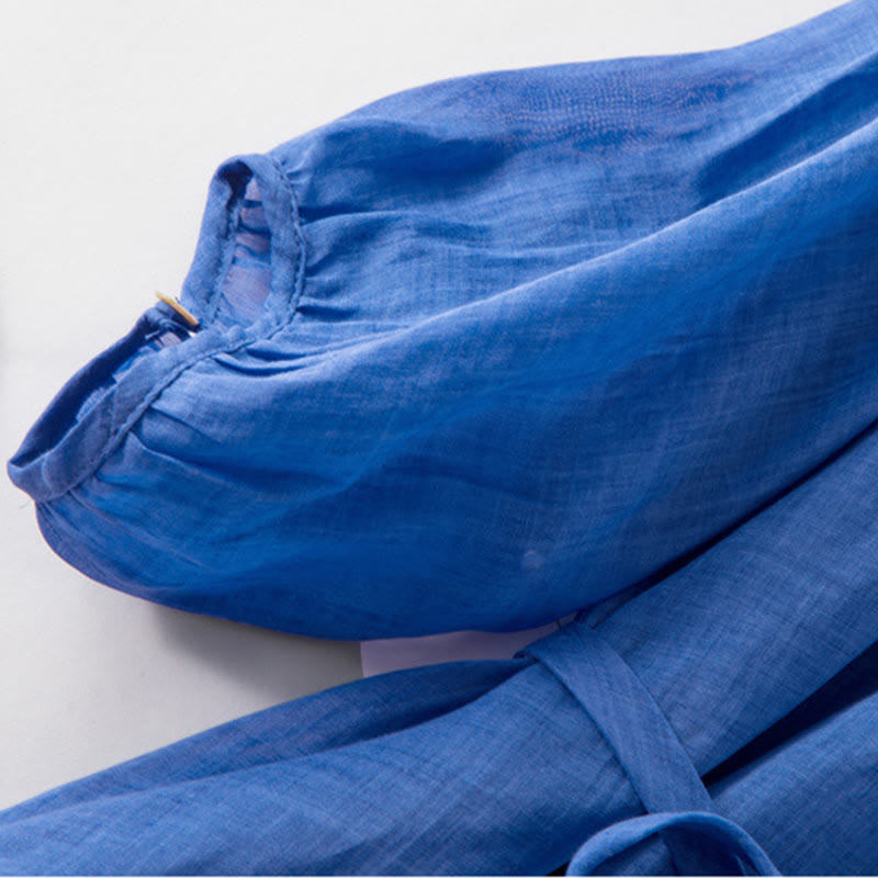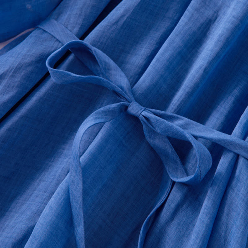 Vestido midi de lino y algodón con mangas abullonadas de tres cuartos y cordón ajustable, con estampado Buddha Stones y bolsillos - Azul - US12,UK/AU16,EU44 (XL) - image 0
