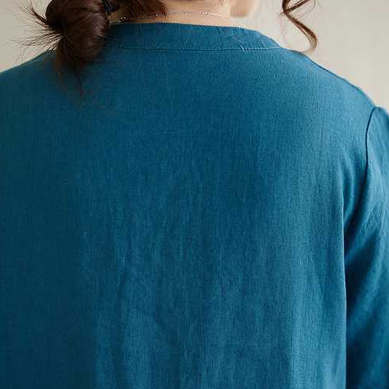 Vestido midi de lino de manga corta con cuello alto y botones, con bolsillos y diseño de Buddha Stones - image 12