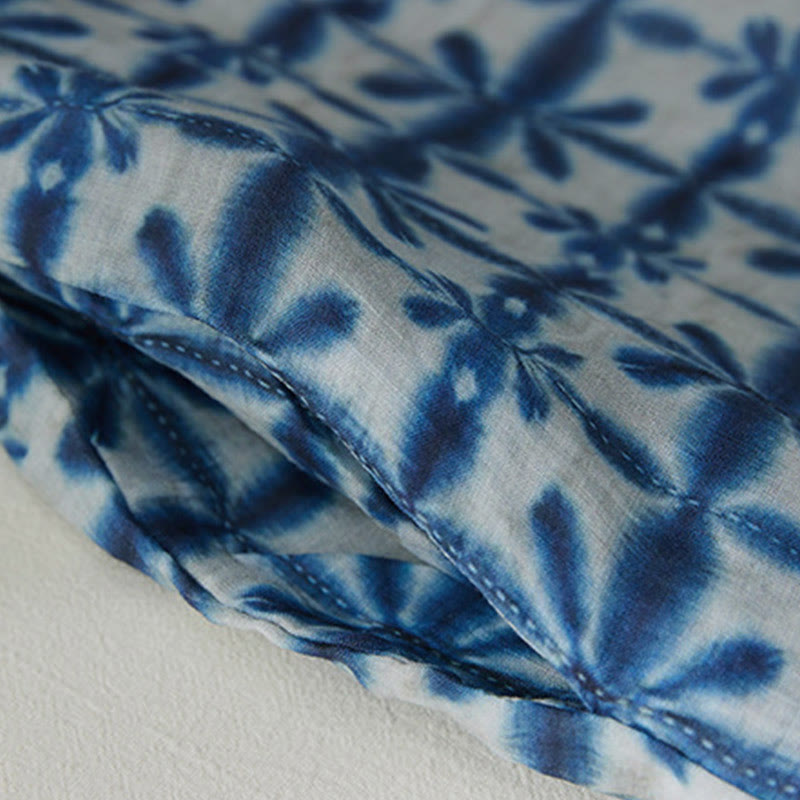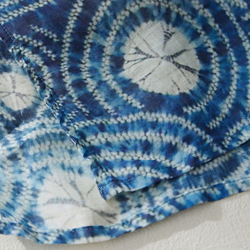 Vestido midi de manga corta con bolsillos y diseño circular de cuello alto con rayas florales azules de verano de Buddha Stones