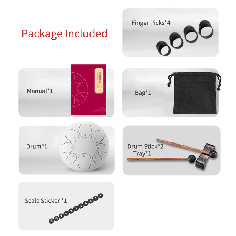 - Paquete: manual*1, pegatina de escala*1, baquetas*2, bandeja*1, bolsa*1, tambor*1, púas para dedos*4