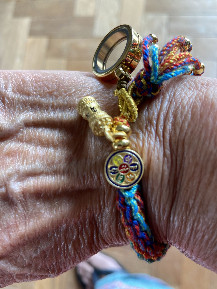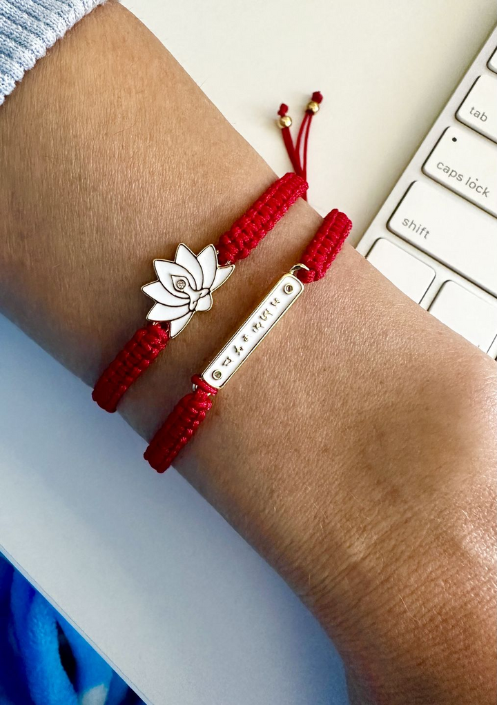 En los linajes del budismo vajrayana tibetano, es común atar una cuerda o hilo alrededor de la muñeca durante las ceremonias. Tradicionalmente, el lama bendice la cuerda y luego hace un nudo y la impregna con un mantra. Al igual que en otras tradiciones, se dice que estos cordones rojos traen suerte y ofrecen protección. En la antigua leyenda china, el hilo rojo del destino es invisible y une a todos aquellos cuyas vidas se entrelazarán. Está regido por el dios chino del matrimonio, Yue Lao, ya que se asocia principalmente con el vínculo entre dos personas destinadas a casarse. A lo largo de la historia y en todas las filosofías, el hilo rojo se ha usado para protección, fe, buena suerte, fuerza y conexión.
